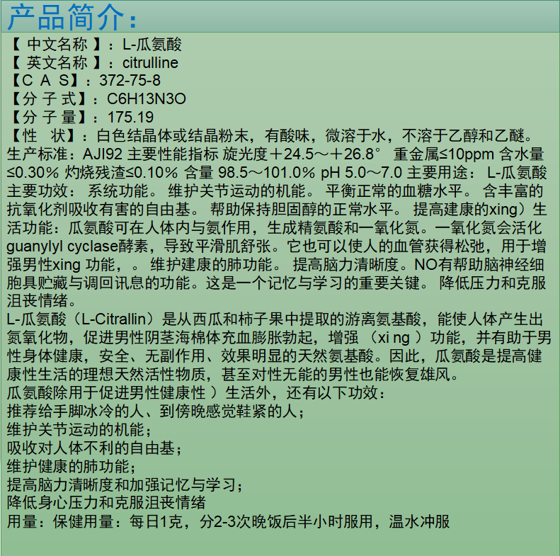 L-瓜氨酸粉食品级男性一氧化氮氮泵扩张可配精氨酸血管citrulline