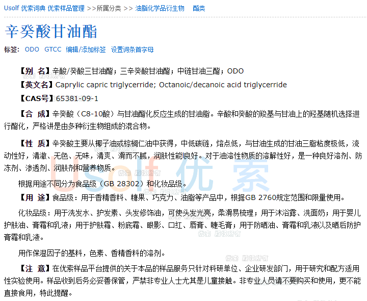 辛癸酸甘油酯  ODO型   500g/瓶 100ml/瓶两种规格