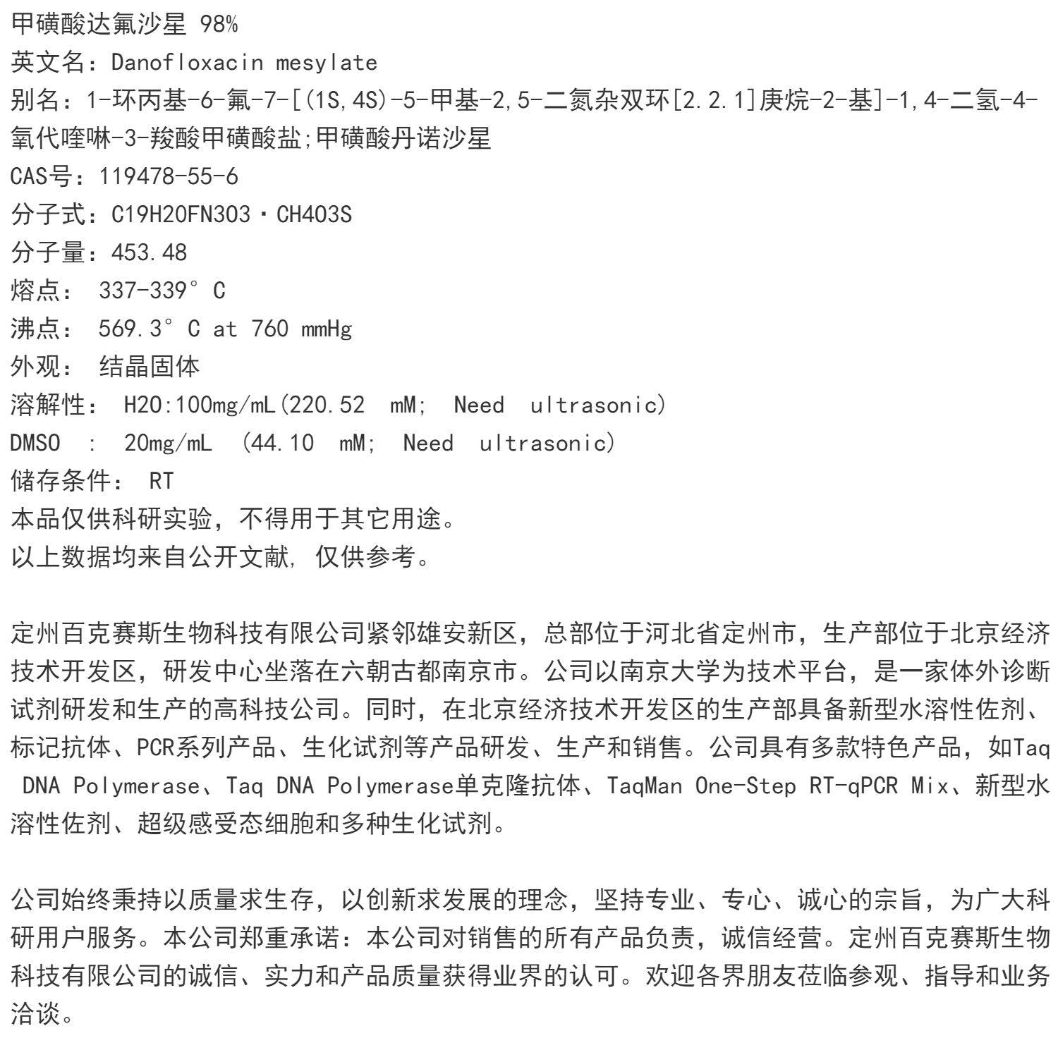 甲磺酸达氟沙星 实验用科研试剂 百克赛斯生物 CAS:119478-55-6