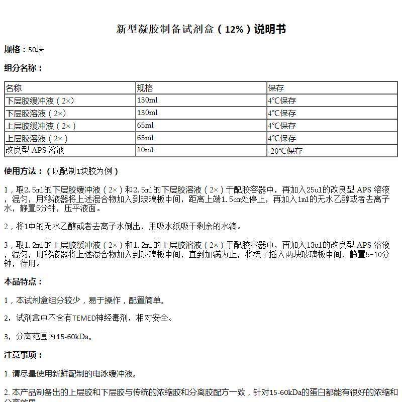 新型SDS-PAGE凝胶制备试剂盒(12%)实验科研用试剂 百克赛斯生物