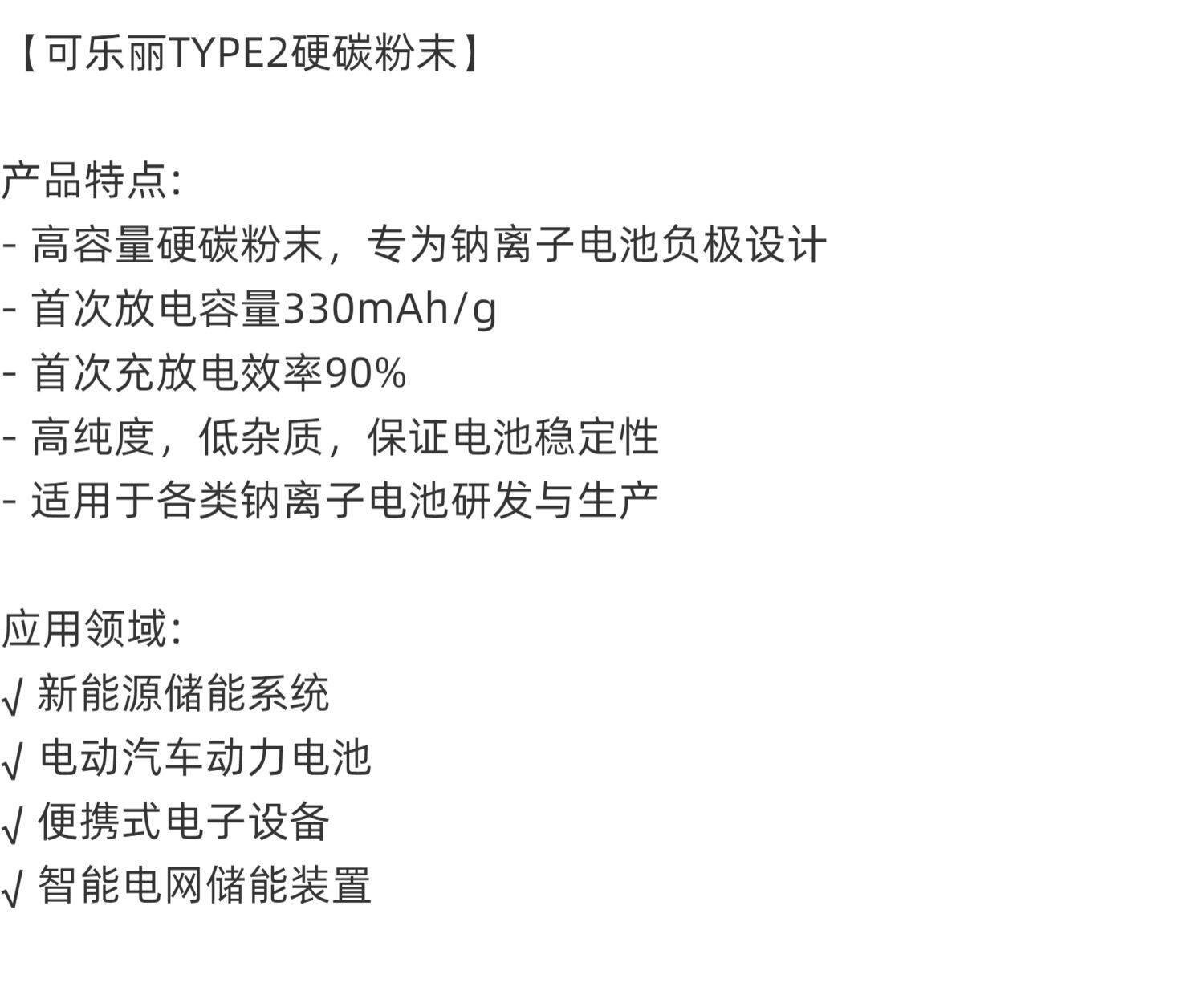 日本可乐丽TYPE2钠离子电池硬碳 放电容量330mAh/g 首效90%
