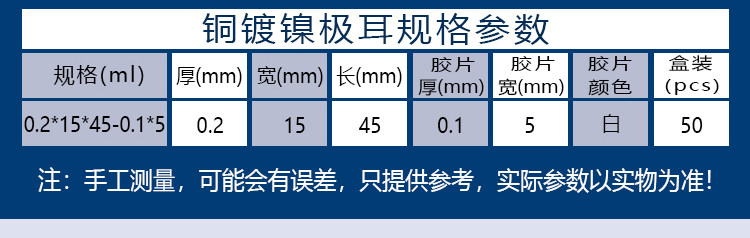 | 铜镀镍极耳0.2*15*45,0.1*5白胶 50pcs/盒 | ¥ 登录可见 | ¥ 登录可见 | 9999 件 | 591020819914 |
