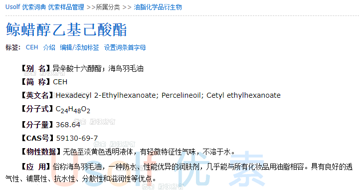 鲸蜡醇乙基己酸酯  CEH  100ml/瓶  450g/瓶