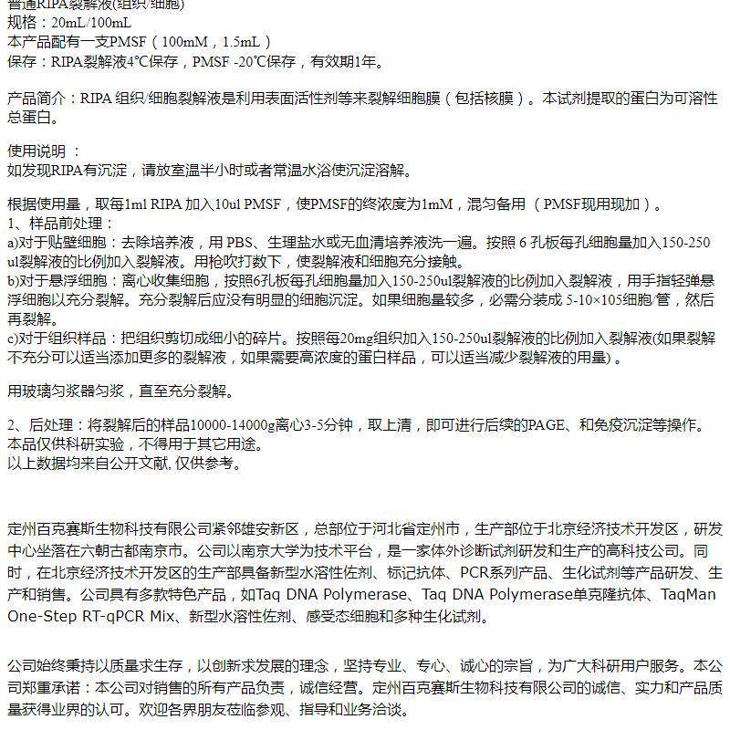 普通RIPA裂解液(组织/细胞) 实验室科研用试剂 百克赛斯生物