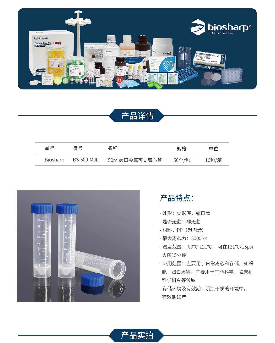 白鲨Biosharp BS-500-MJL 50ml螺口尖底可立离心管 非无菌