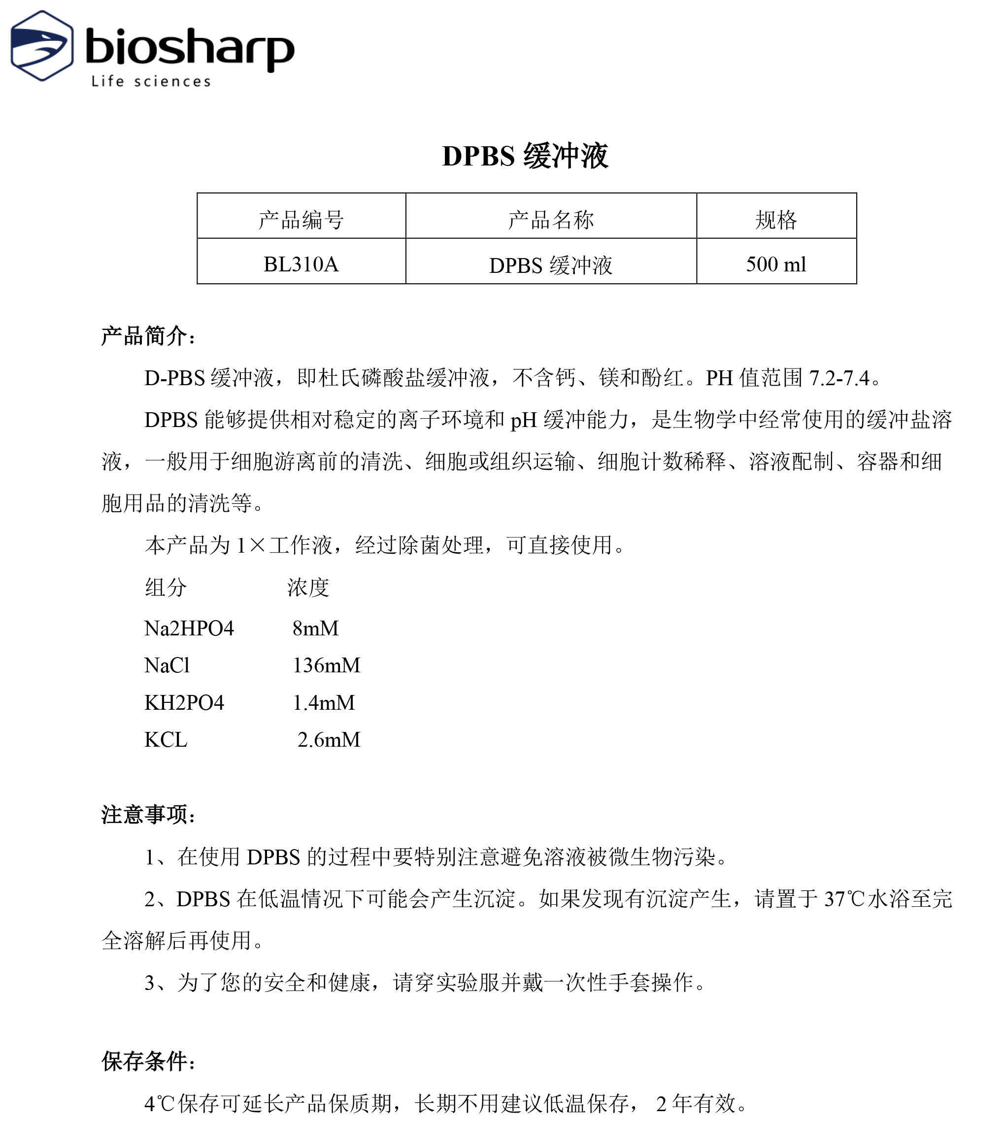 白鲨biosharp BL310A 1×D-PBS缓冲液 不含钙镁酚红 PH值7.2-7.4