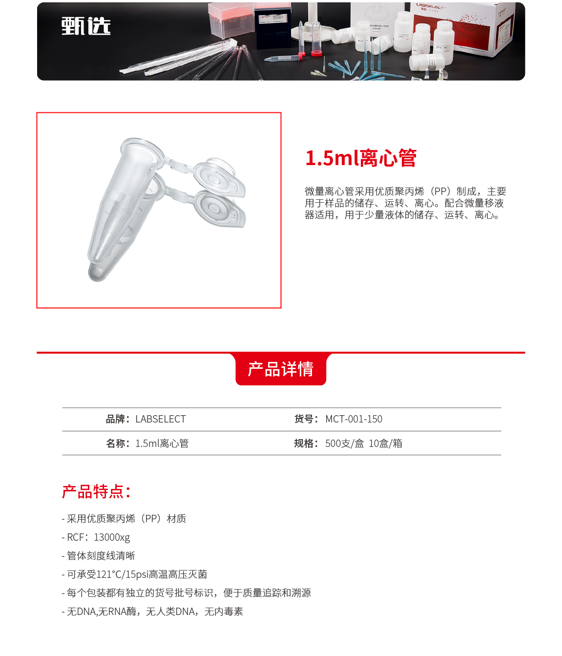 甄选LABSELECT MCT-001-150 1.5ml离心管 透明RCF13000xg500支/盒