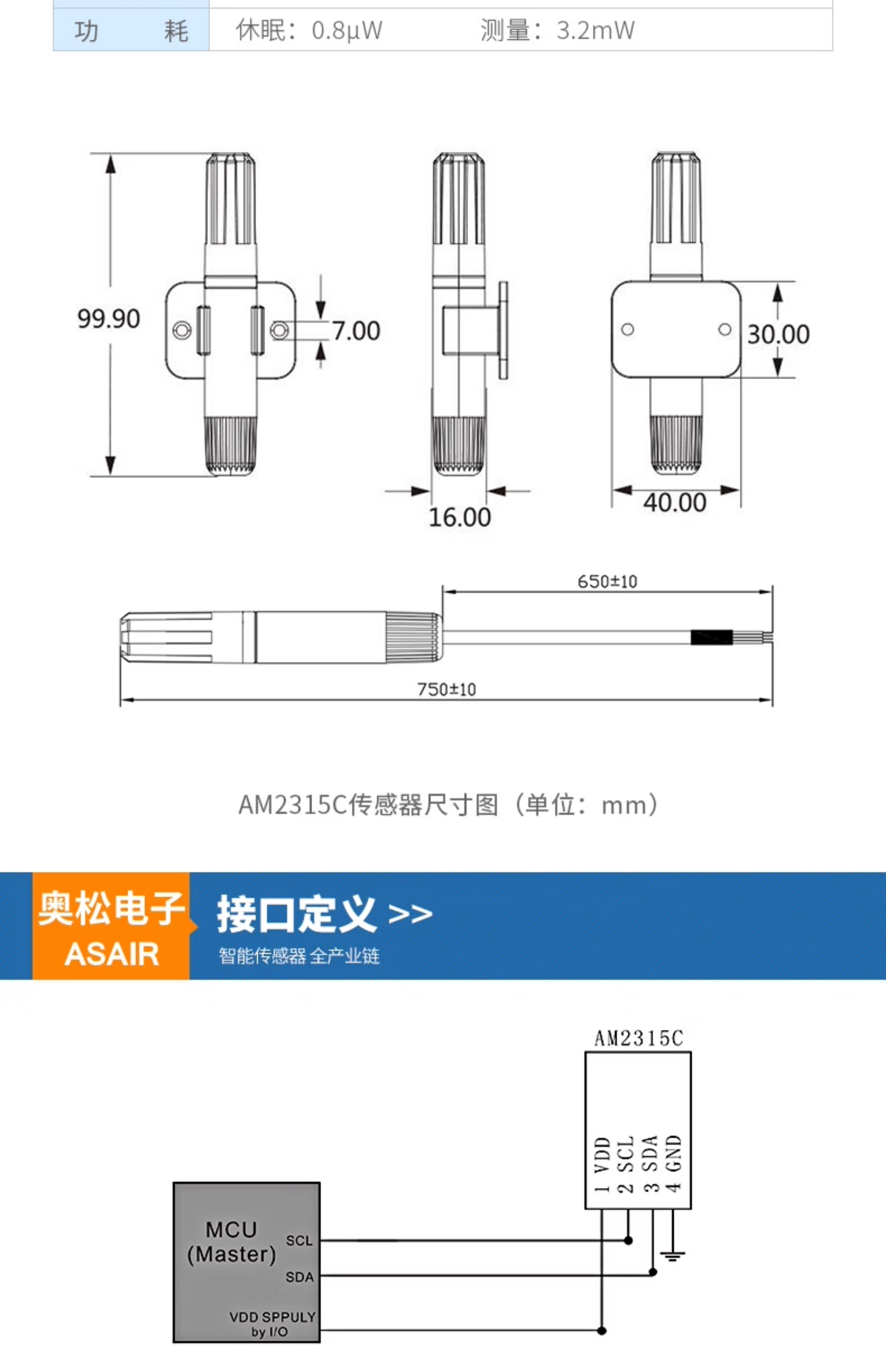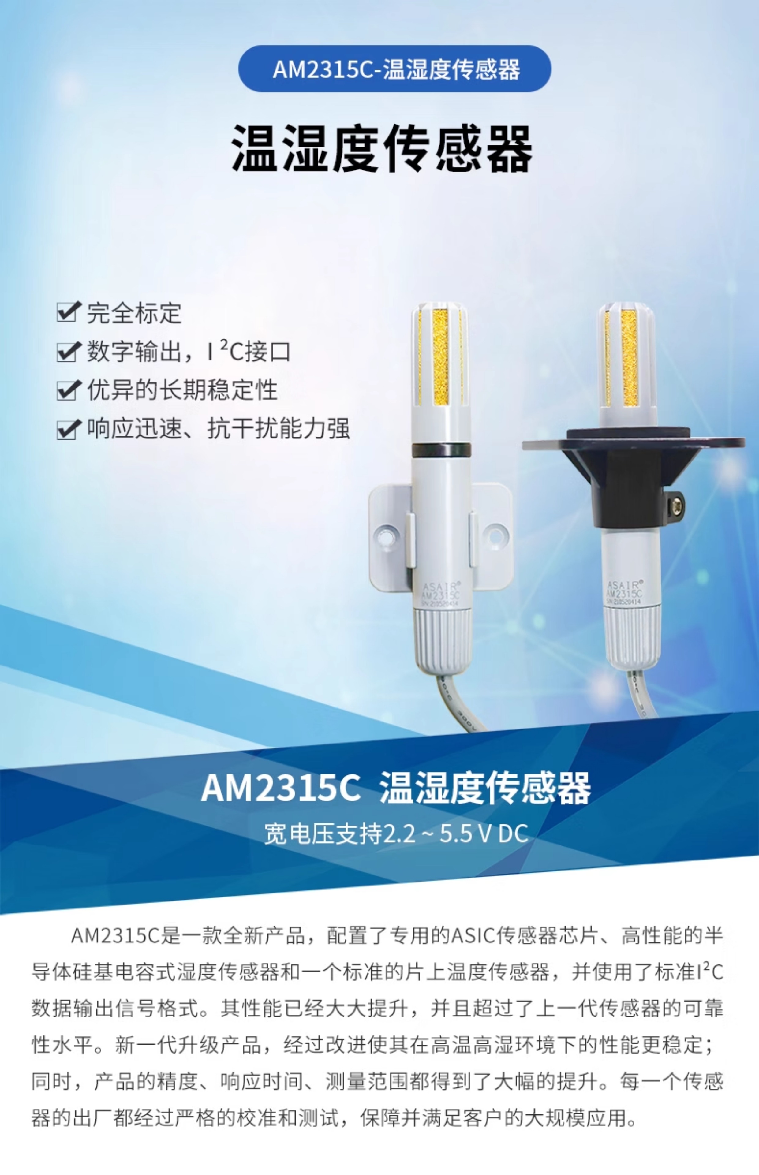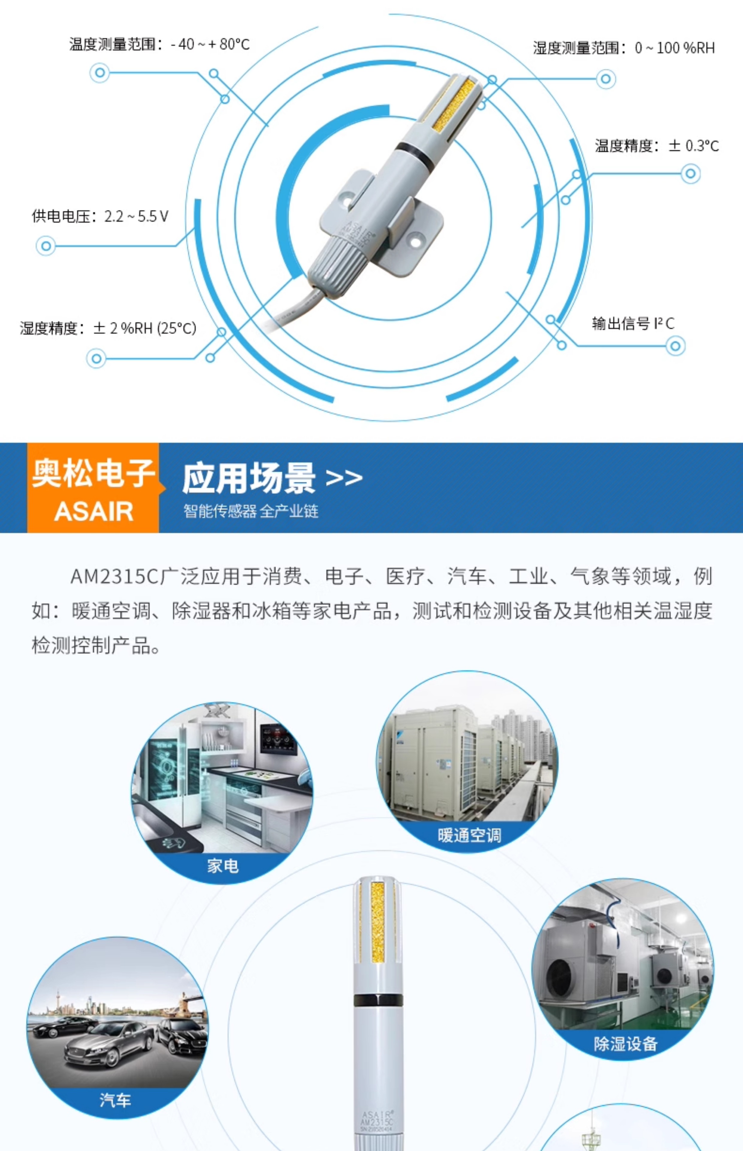 ASAIR奥松风管道式壁挂式温湿度传感器探头工业高精度AM2315C