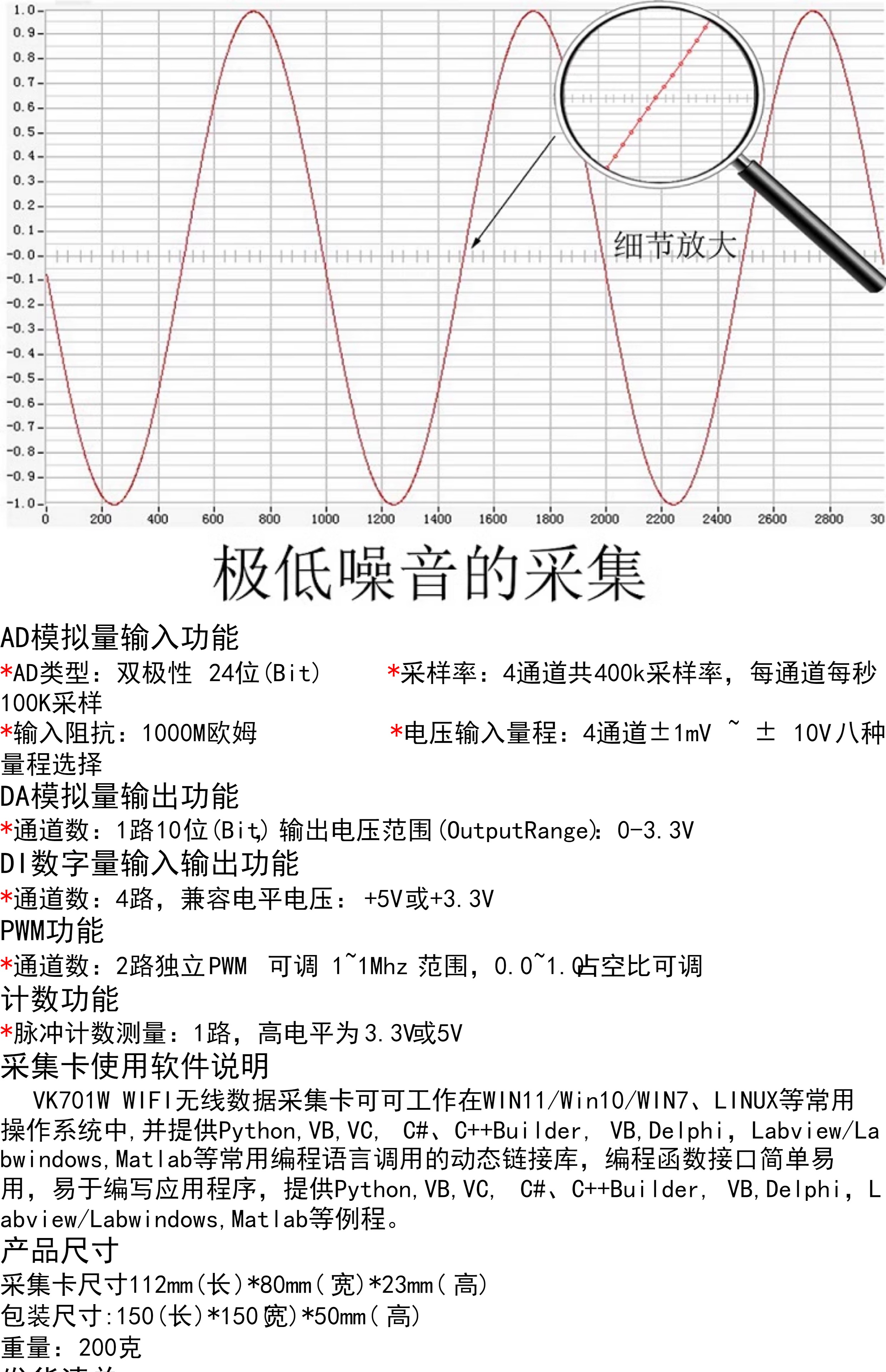 VK701W四通道无线数据采集卡WIFI 100KSPS同步 微伏采集 厂家直销